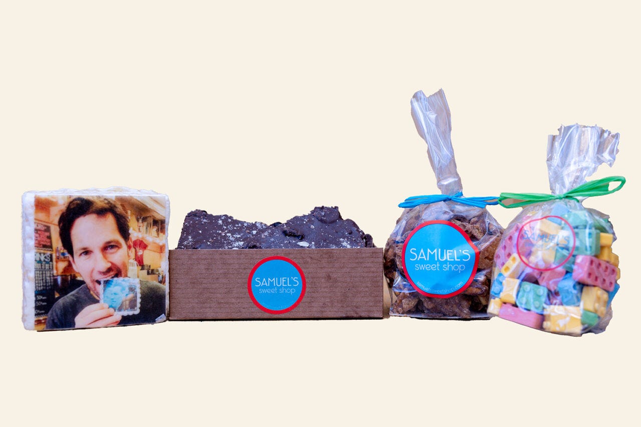 Samuel’s Sweet Shop has some classic items you’ll find in most candy shops, though they also have some sillier things in stock. In addition to “favorites samplers” from Paul, Jeffrey, and Hilarie, you can get Wonka-themed bars or Rice Krispies treats with the owners’ faces or Halloween monsters on them.